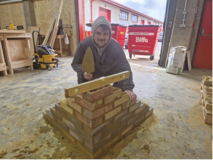 Harry showing off his half brick corner assessment, which he passed with flying colours. Harry has enjoyed every single minute of his time and cups of tea in the workshop and is very close to completing his qualification.
