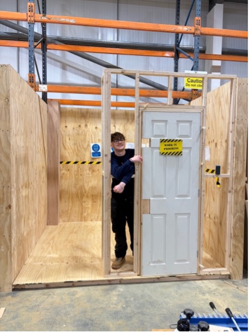 Regan - Level 2 Site Joinery student - showing off his practical assessment (stud partition wall and door hanging.